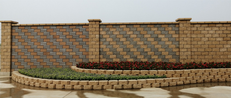 此產品不僅具有普通承重砌塊的優良性能,而且具有與石材一樣的裝飾外表面,把承重和裝飾結為一體,在施工時建筑結構同步完成。其裝飾效果可以通過單一品種或多種砌塊組砌、設計排磚方法、與其它裝飾材料配合應用、適當選用灰縫的顏色、以及改變局部墻體砌塊的凹凸程度等各種措施加以實現。裝飾砌塊不僅應用于室外,也可以用于室內墻面。其中,條紋面、劈裂面和磨光面效果,古樸、典雅、風格前衛。