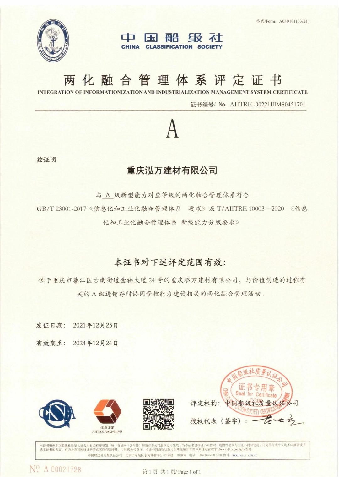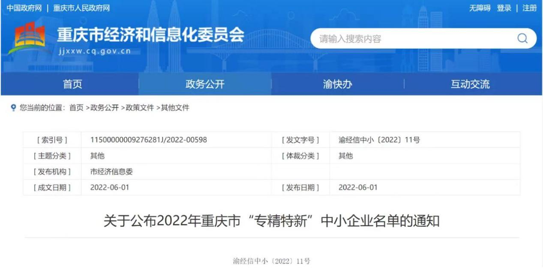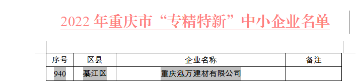 2022年6月1日,重慶市經濟和信息化委員會公布了2022年重慶市“專精特新”中小企業名單。重慶泓萬建材有限公司榮獲“專精特新”企業稱號!
